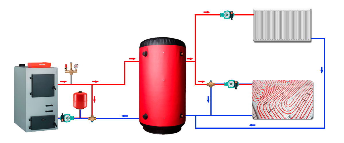 При виборі потужності твердопаливного котла завжди потужність котла, який купують перевищує потрібну потужність для опалення будинку. Це призводить до того, що зайва енергія вилітає в димову трубу. При експлуатації в тандемі твердопаливний котел і ємність, що акумулює маємо:
