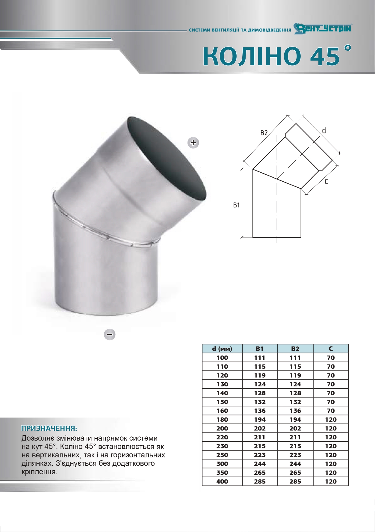 Код: Коліно 45° із нержавіючої сталі 0,8мм AISI 304