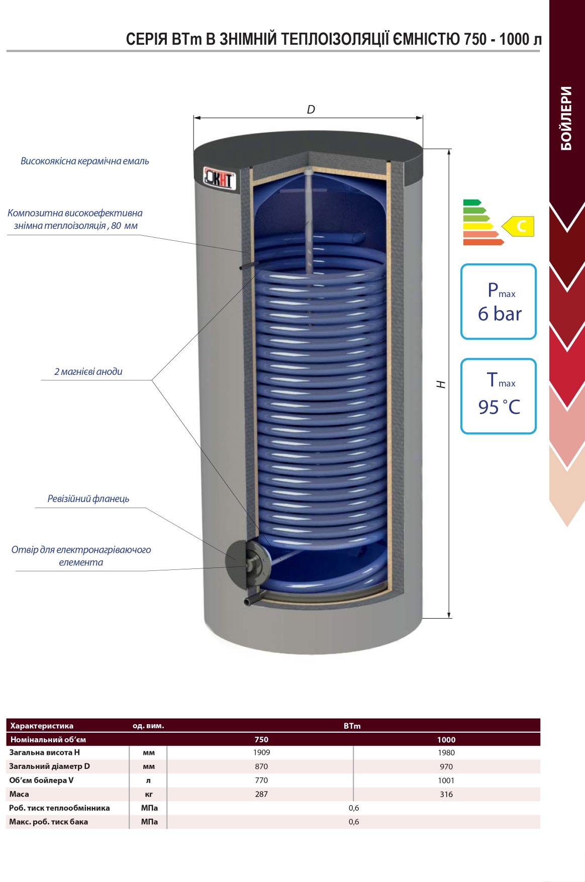 Бойлер для теплового насоса КНТ ВТm-200 (об”єм 200л), площа теплообмінника 2,4 м².