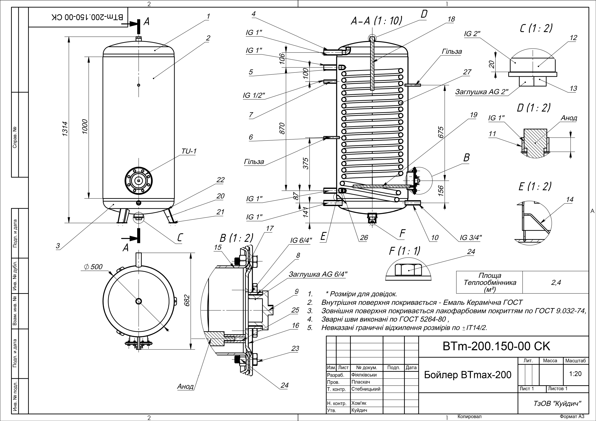 Бойлер КНТ ВТ-01-200 (об’єм 200л), площа теплообмінника 0,92 м².